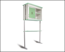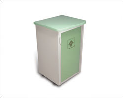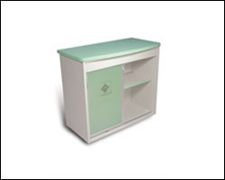 mobile in bilaminato grigio con 1 anta in alluminio e cristallo sabbiato verde con logo trasparente