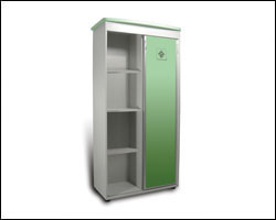 mobile in bilaminato grigio con antina scorrevole in alluminio e cristallo sabbiato verde con logo trasparente