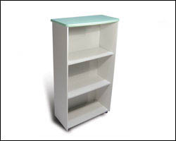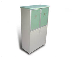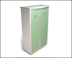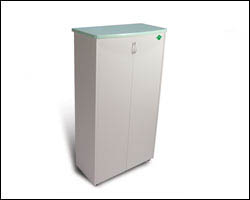 mobile in bilaminato grigio con due ante in alluminio e cristallo sabbiato verde con logo trasparente