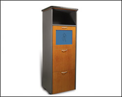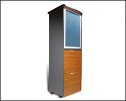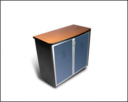 mobile in bilaminato antracite con 1 anta in alluminio e cristallo sabbiato blu con logo trasparente e 2 cassetti archivio in bilaminato color ciliegio