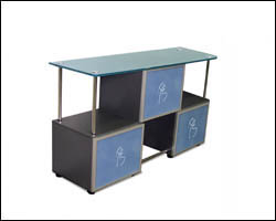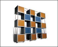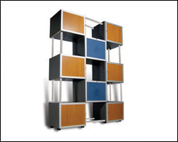 mobile a cubi con 2 antine in alluminio e cristallo sabbiato blu con logo trasparente e 8 antine in bilaminato color ciliegio - pali in acciaio cromato