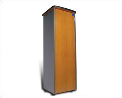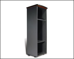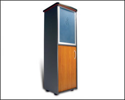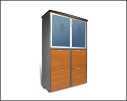 mobile in bilaminato antracite con due ante in alluminio e cristallo sabbiato blu con logo trasparente e quattro cassetti archivio in bilaminato color ciliegio