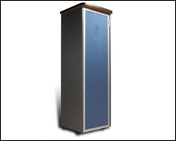 mobile in bilaminato antracite con 1 anta in alluminio e cristallo sabbiato blu con logo trasparente