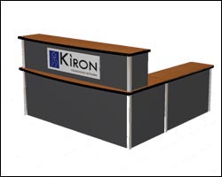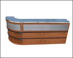 bancone reception con piano in bilaminato di pioppo color ciliegio struttura in bilaminato antracite con gambe cromo D.80 mm . Accessori : vetrofania e allungo pc
