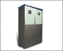 T100 Bis Clax TR L cm 102 A cm 147 P cm 42 mobile in bilaminato antracite con due ante in alluminio e cristallo sabbiato con logo trasparente e quattro cassetti archivio in bilaminato antracite